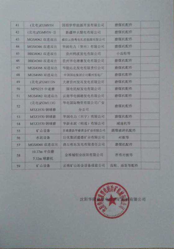 沈陽華隆重型電站冶礦機(jī)械有限公司業(yè)績表(部分)